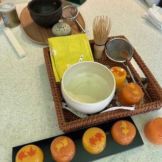 最後は私からも皆さんへ一服差し上げました。この日は杏仁豆腐に抹茶をかけて、金木犀の花を散らしてみました。(当日の器とは違いますが、こちらは試作品。茶道教室の生徒さんにも人気でした。)